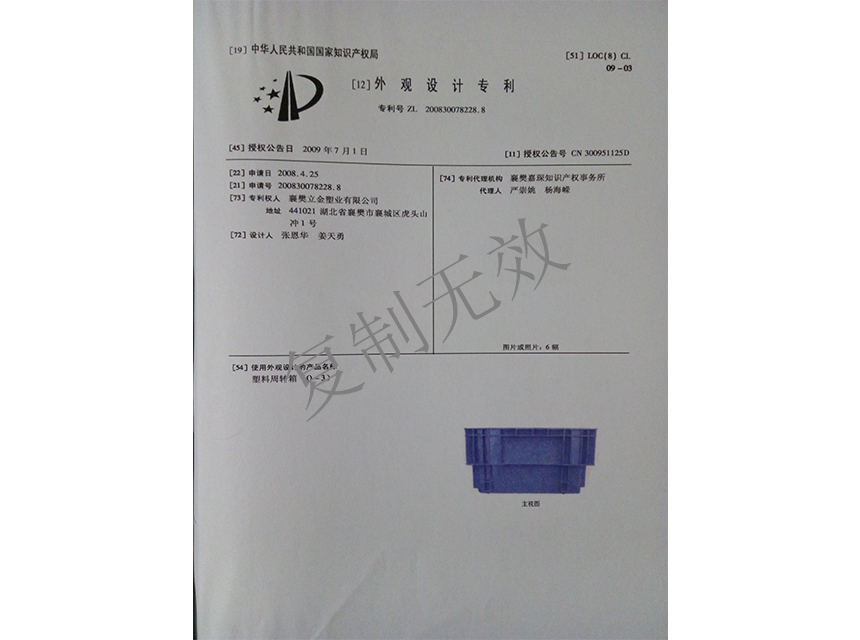 下一篇:塑料周轉箱(Z-1)外觀設計專利證書